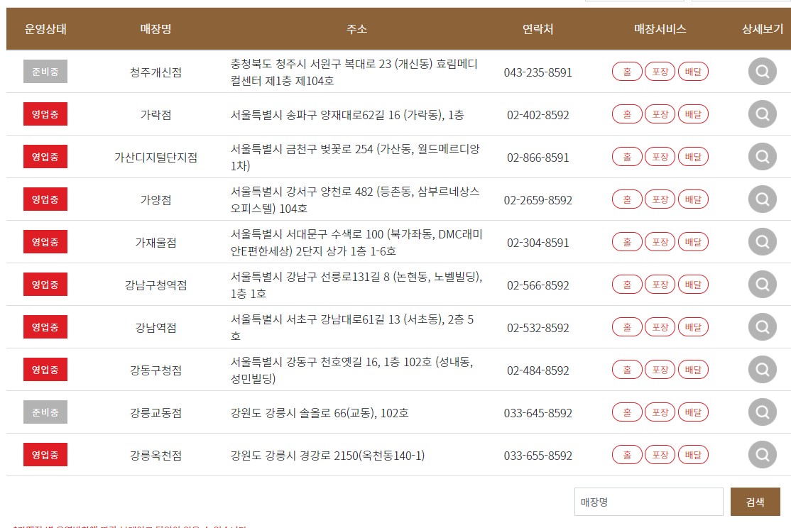 해당 지점 목록이 쭉 나오는데요 가산디지털지점부터 해서 강릉교동점 옥천점 강남구청역점등 우리동네 지점을 검색을 하고 해당 지점에 대한 영업시간을확인하시면 됩니다.
