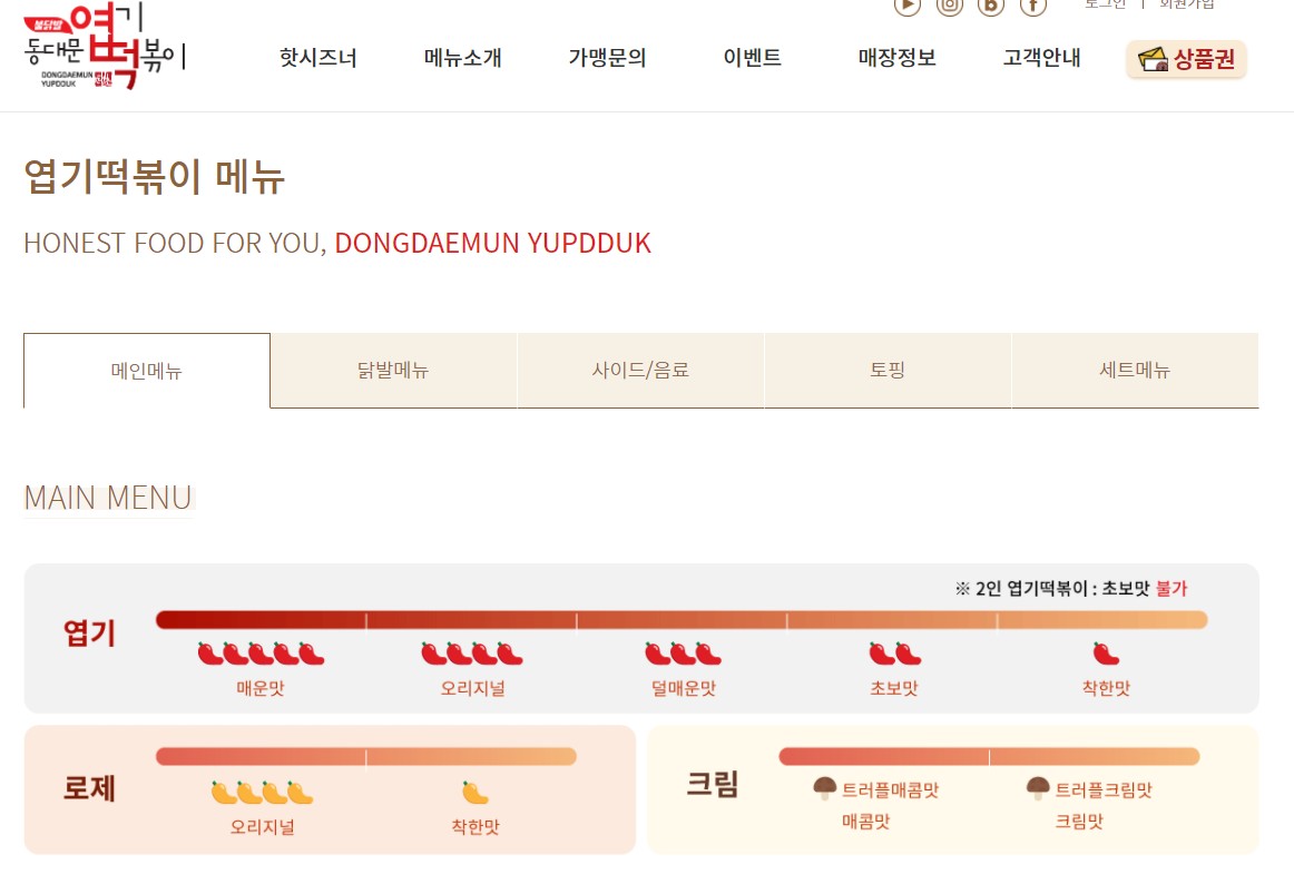 메인메뉴를 보면 엽기 로제 오리지널 착한맛 덜매운맛등 다양한 종류와 크림도 트러플매콤맛등이 있는것을 알수 있네요