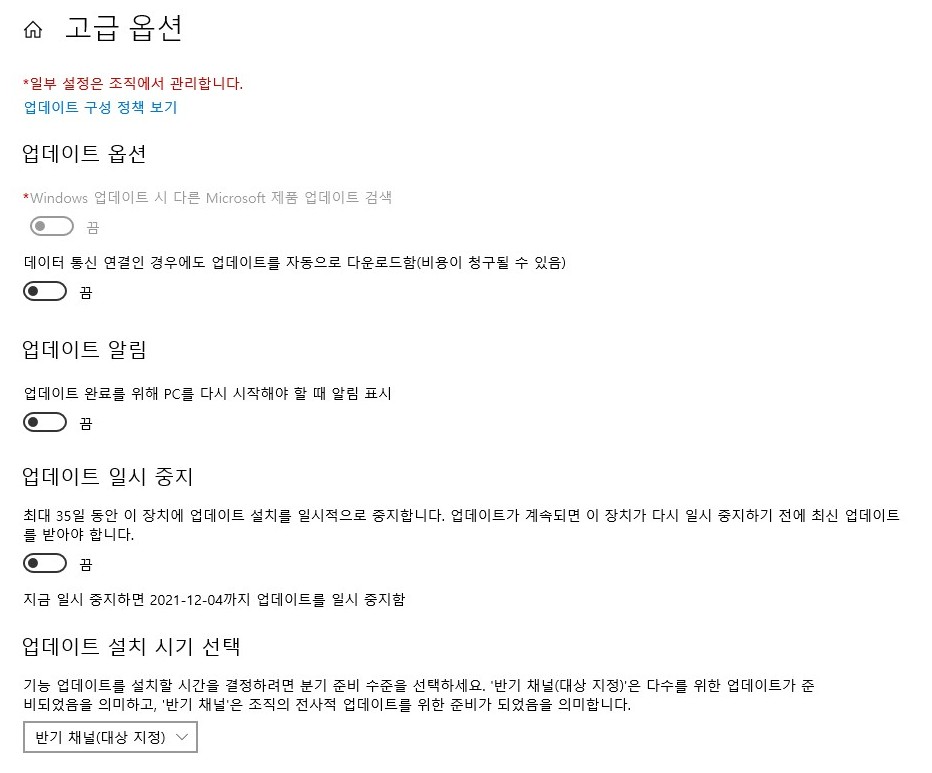 고급옵션을 가면 저는 최대한 업데이트는 일시 중지를 통해서 금으로 해놓고 그리고 업데이트 설치 시기도 선택이 가능한데요 반기로 해서 최대한 연장하고 미뤄놓은것을 선택을 했습니다.