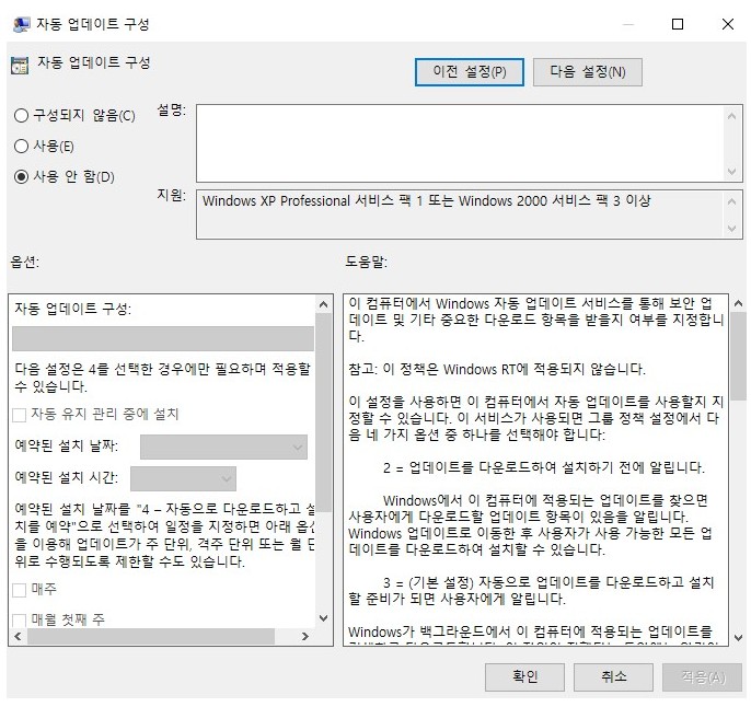 그외에 업데이트 설치하기 전에 알려주기도 하도 주 격주 단위등으로 위 항목이 실행되기 전에 수행 제한이 일어나는 것을 알수 있습니다.