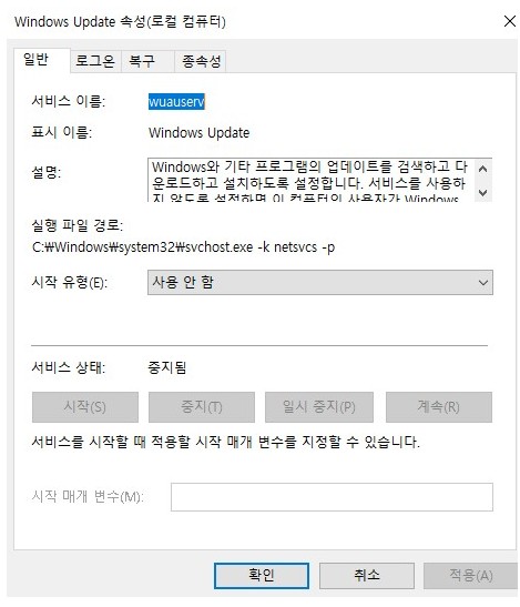 윈도우즈 업데이트 관련된 파일을 현재 local system으로 되어있는데요 수동에서 사용안함으로 변경을 합니다.