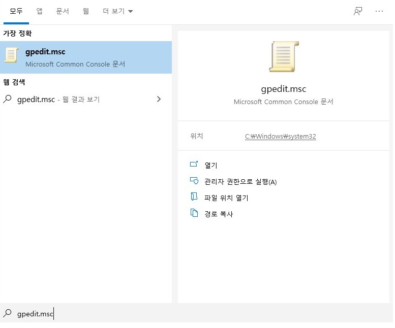그리고 위와같이 자신의 컴퓨터를 설정을 했다고 끝나는 것이 아니라 다음과 같은 msc 파일 조정이 필요한데요 여기서 gpedit.msc 를 선택을 해줍니다.