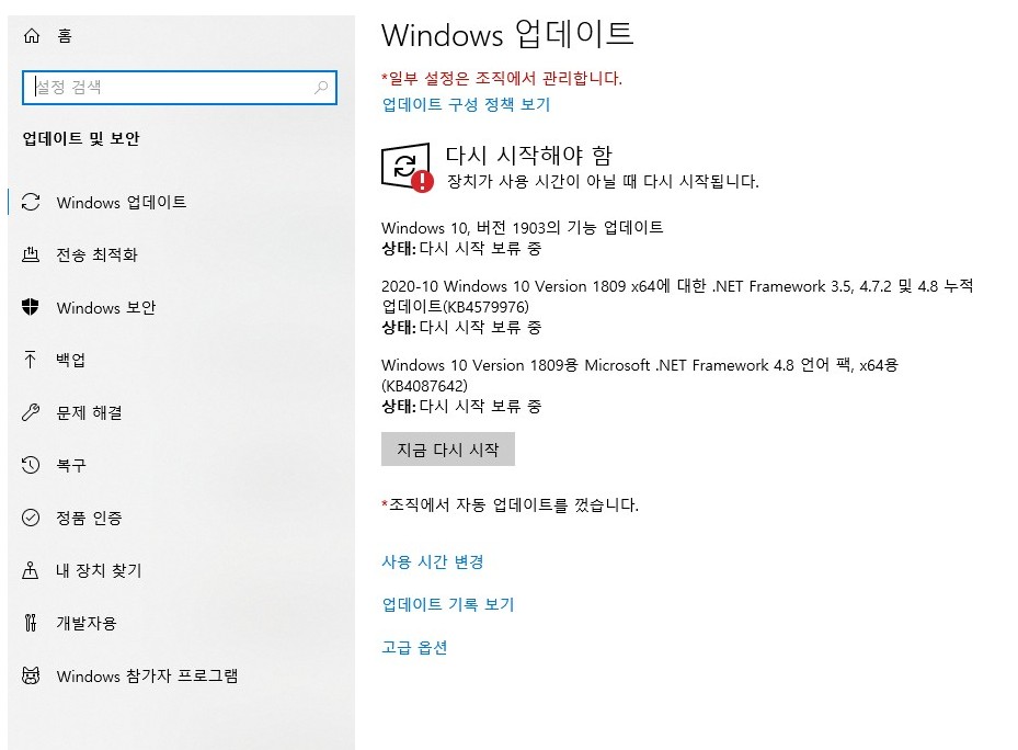 다시시작하면 여러가지 기능 업데이트가 되고 있는데요 다시 시작 보류중이거나 위와같은 업데이트가 꼭 필요한가 하는 생각이 듭니다.