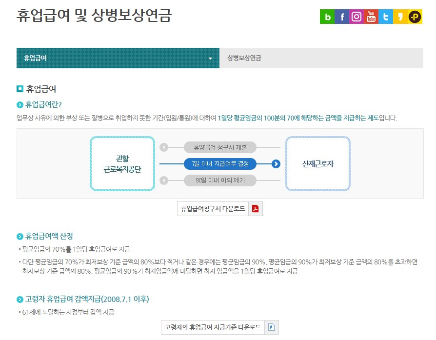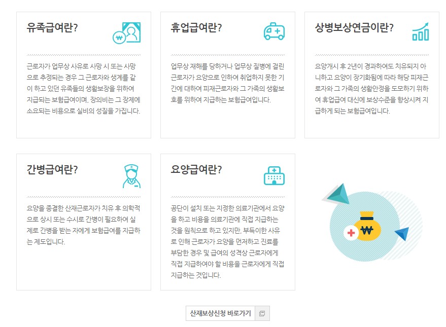 그외에도 이렇게 다치게 되면 회사에서 일도 못하게 됨으로 휴업급여나 요양급여등 다양한 안내가 나와있습니다.