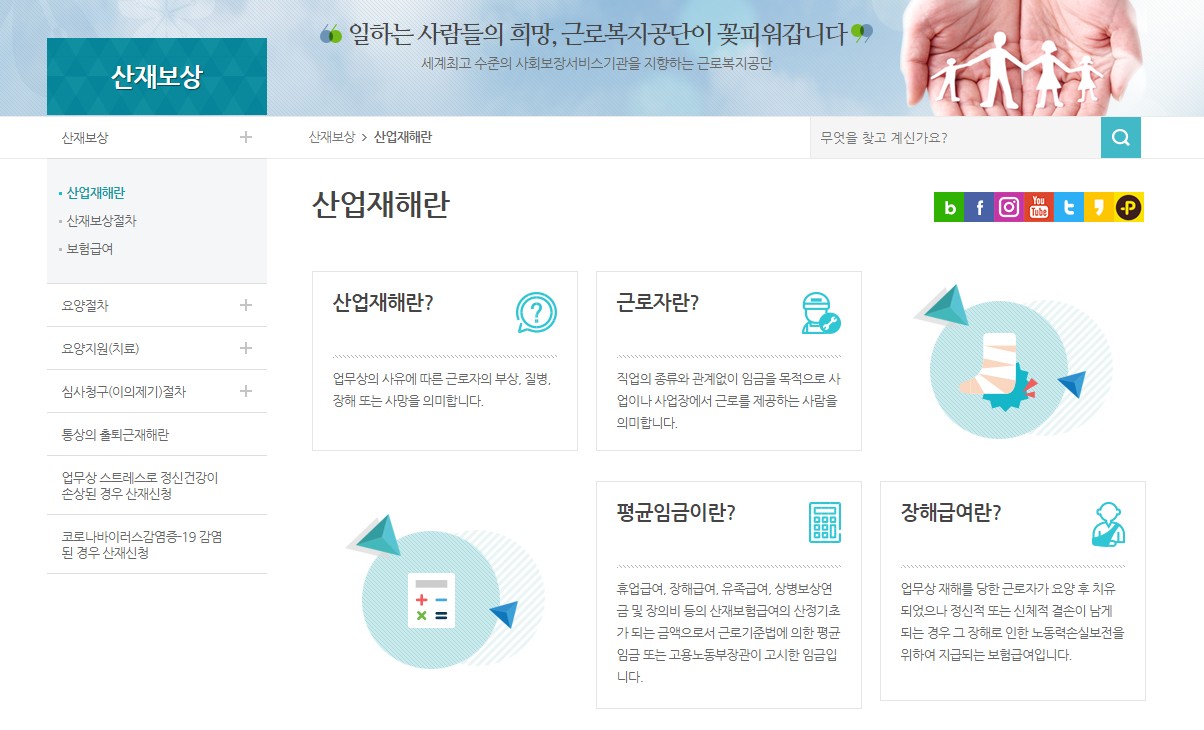 업무상 재해를 보면 위와같이 요양 보상 그리고 재활특진 맞춤형 통합서비스등을 이용해서 할수 잇습니다.