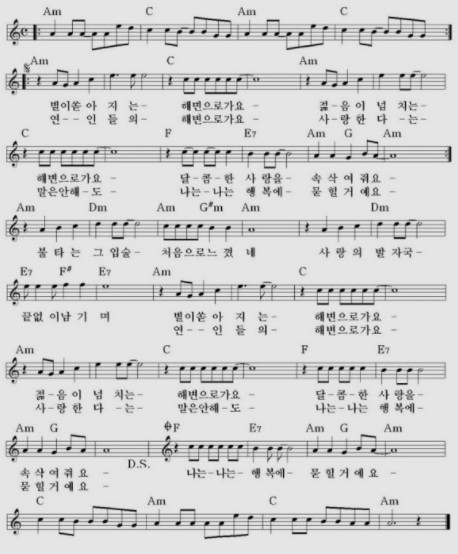 그외에도 우리가 여름철에 단골로 불렀던 노래죠 해변으로 가요도 간단한 기타 코드 g am c 등으로만 이루어져 있으니까요 이런것은 몇번 연습하면 바로 익힐수가 있습니다.